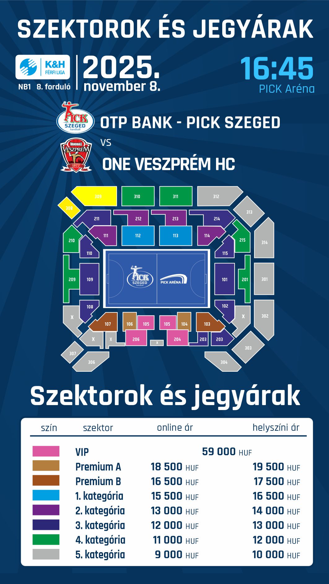Az értékesítés során először az első és második emeleti, illetve a 311- 313-as szektorokat nyitjuk meg. Amikor az ezekre a helyekre szóló jegyek elkelnek, a PICK Aréna fennmaradó, harmadik emeleti szektorait is megnyitjuk.