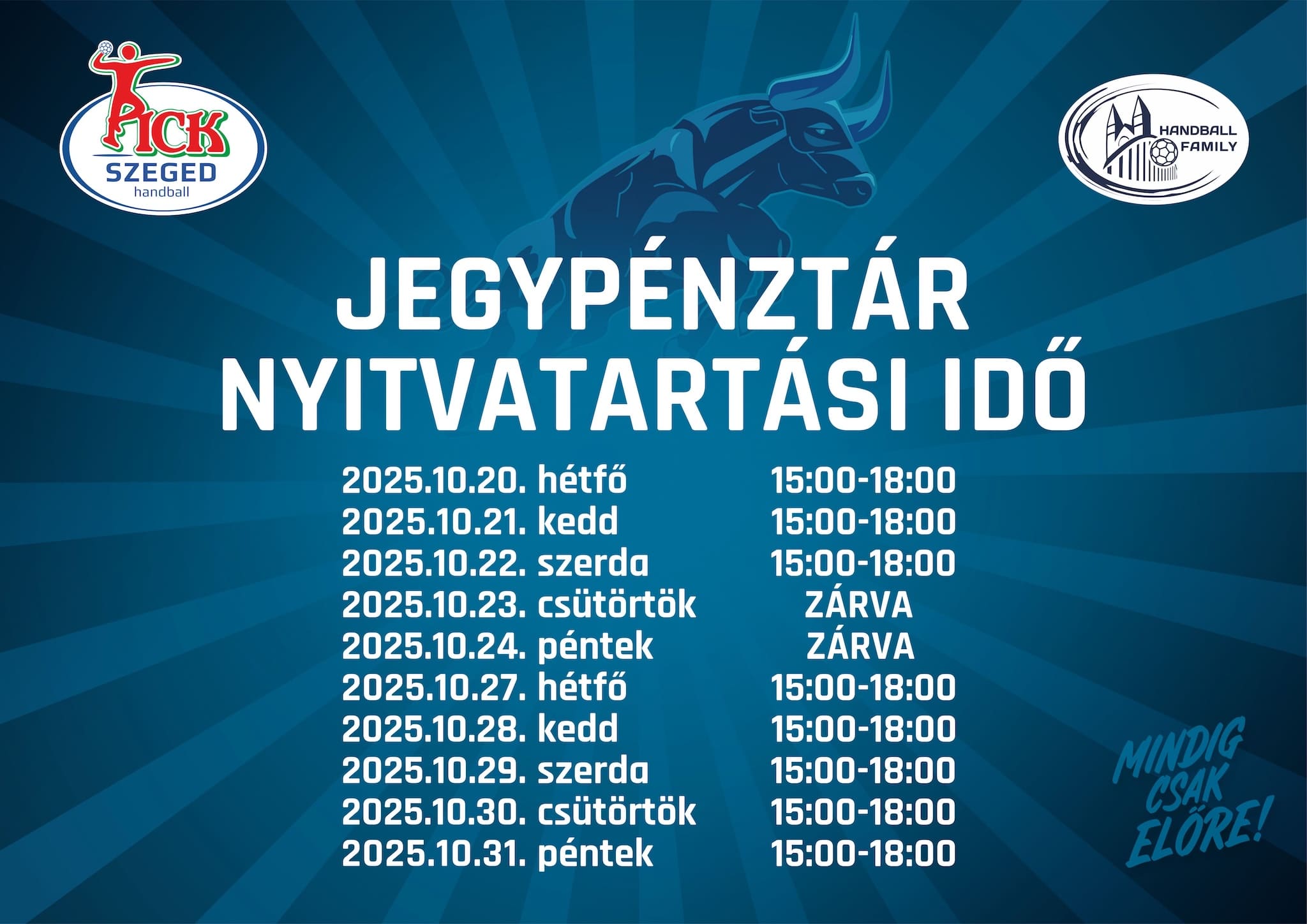 Október 20-tól október 31-ig munkanapokon 15:00-18:00 között a PICK Aréna jegypénztáraiban tudod beszerezni a belépőket. Október 23-26 között a jegypénztár zárva tart. A jegypénztár nyitvatartási idejében a szurkolói boltban a jegyértékesítés szünetel.