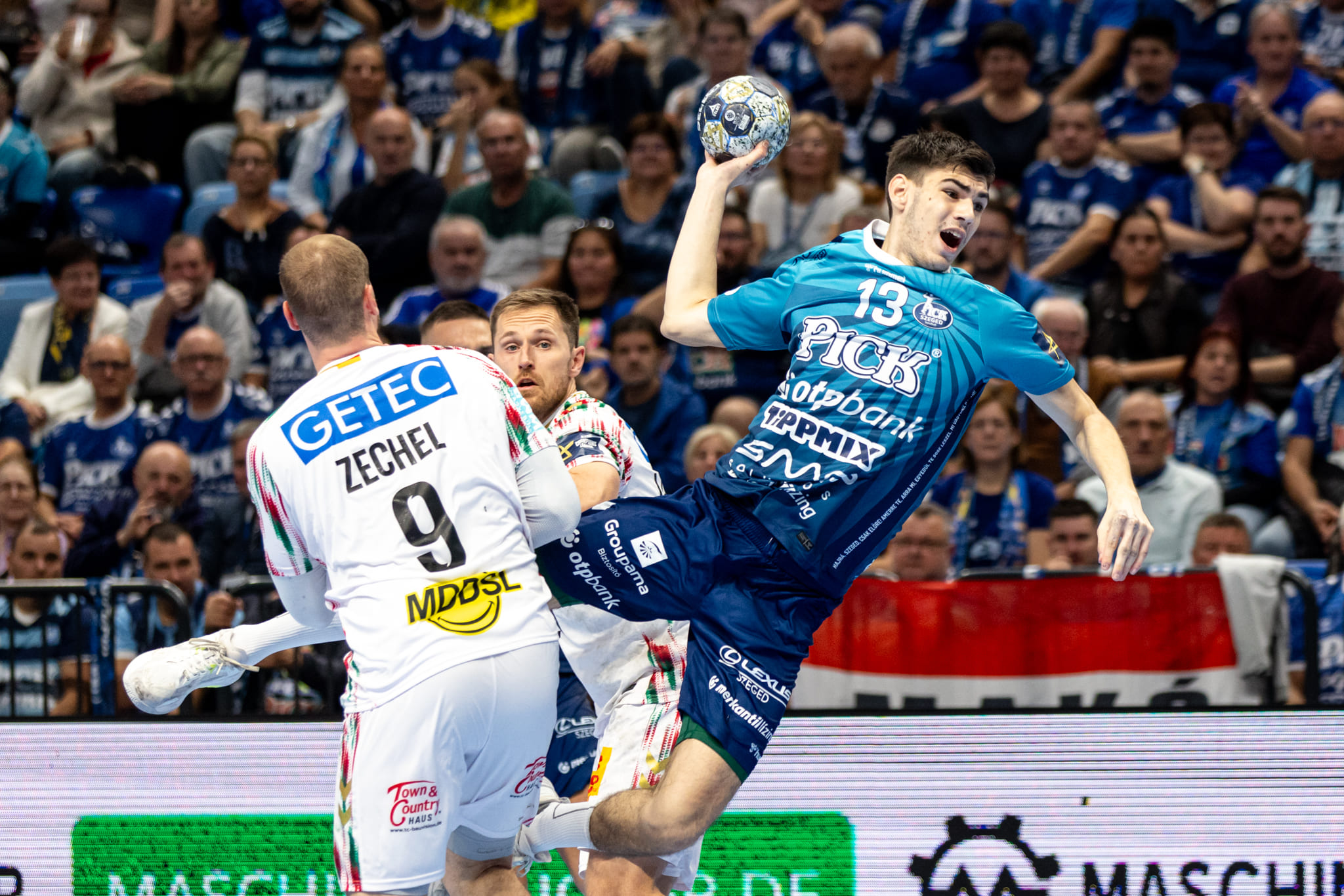 Vendégszurkolók is érkeztek az összecsapásra: emelte a meccs hangulatát, amikor a két tábor hangpárbajt vívott a lelátón – azért a 6182 néző között többnyire a „Szeged” kiáltásokat lehetett hallani. Felváltva estek a gólok, közben a szegedi kapuba Tobias Thulin állt be, 9–11-nél pedig időt kért Michael Apelgren. Bánhidi csodás gólt szerzett beállóból, 10–11-nél megint egyre jöttünk fel. A meccs addigi legszebb találatát Kukics hozta össze a 23. percben, amikor Garciandia passzát vette át és lőtte be a levegőben úszva, ezzel lett 12–13. Szerb légiósunk következő próbálkozását védte Hernandez, a túloldalon Zechel gólja így először jelentett háromgólos különbséget, 12–15. A félidő hajrájában Bánhidi, Sostaric és Bodó talált be, Thulin védésének is tapsolhattunk, de a precíz német támadások miatt a szünetre 15–18-es eredménnyel vonulhattak a csapatok.