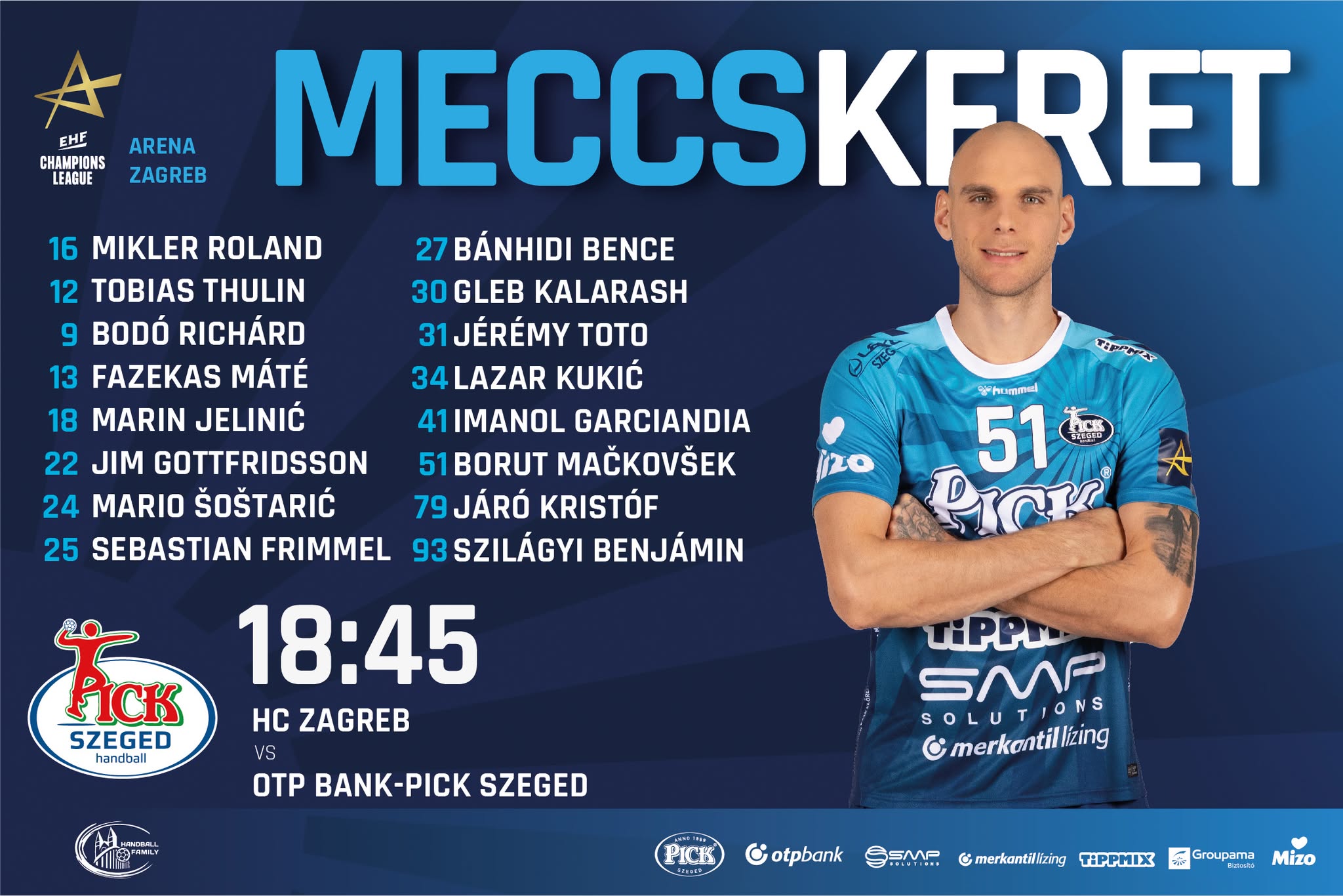 OTP Bank-PICK Szeged okt. 22. szerda 18:45 Zágráb Arena Zagreb